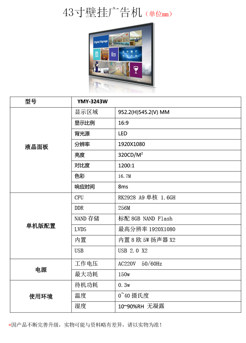 43寸壁掛式單機版廣告機